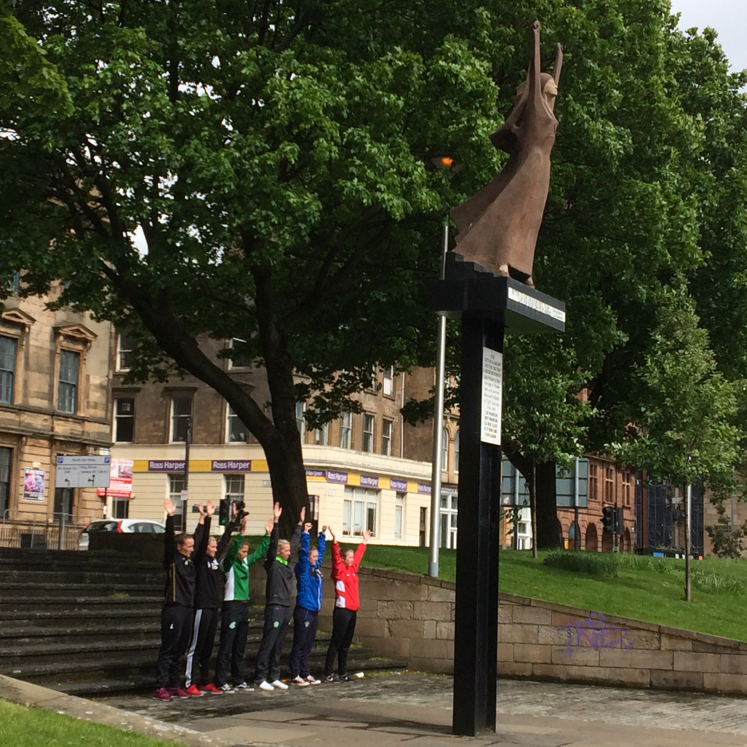 As well as filming a football flash mob in the city centre (in the pouring rain and howling wind) with the captains of the SWPL, a bagpipe band and some amazing volunteers including our “GIRL” Scarlett McCafferty and sandwich board man Aaron Connolly, we shot scenes with the girls at various locations in Glasgow, all sites of significance in the context of formidable (and often forgotten, or never even remembered!) women of history. You can find out more about these powerful women by going on one of the Women’s Heritage Walks organised by the incredible (inspiring) people at the Women’s Library in Glasgow. The sites celebrate the lives, histories and achievements of women.